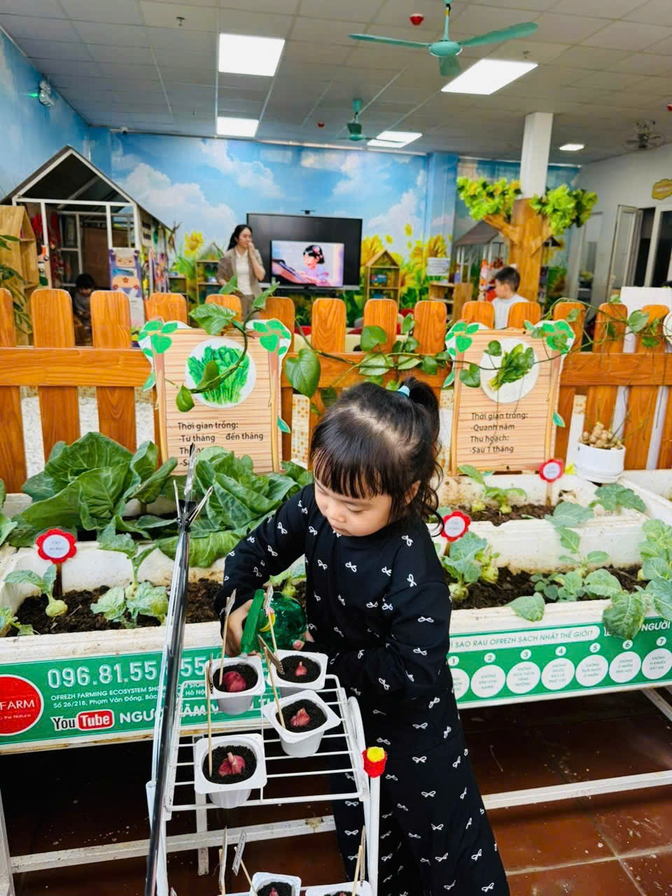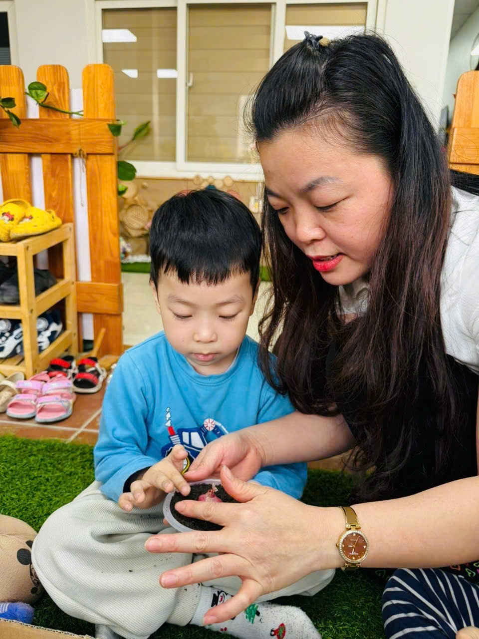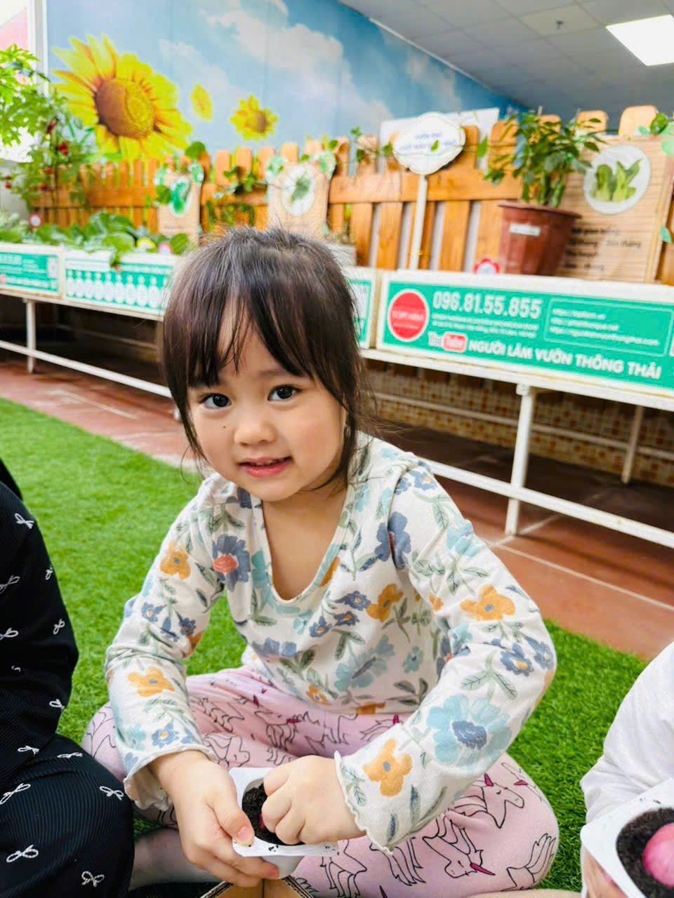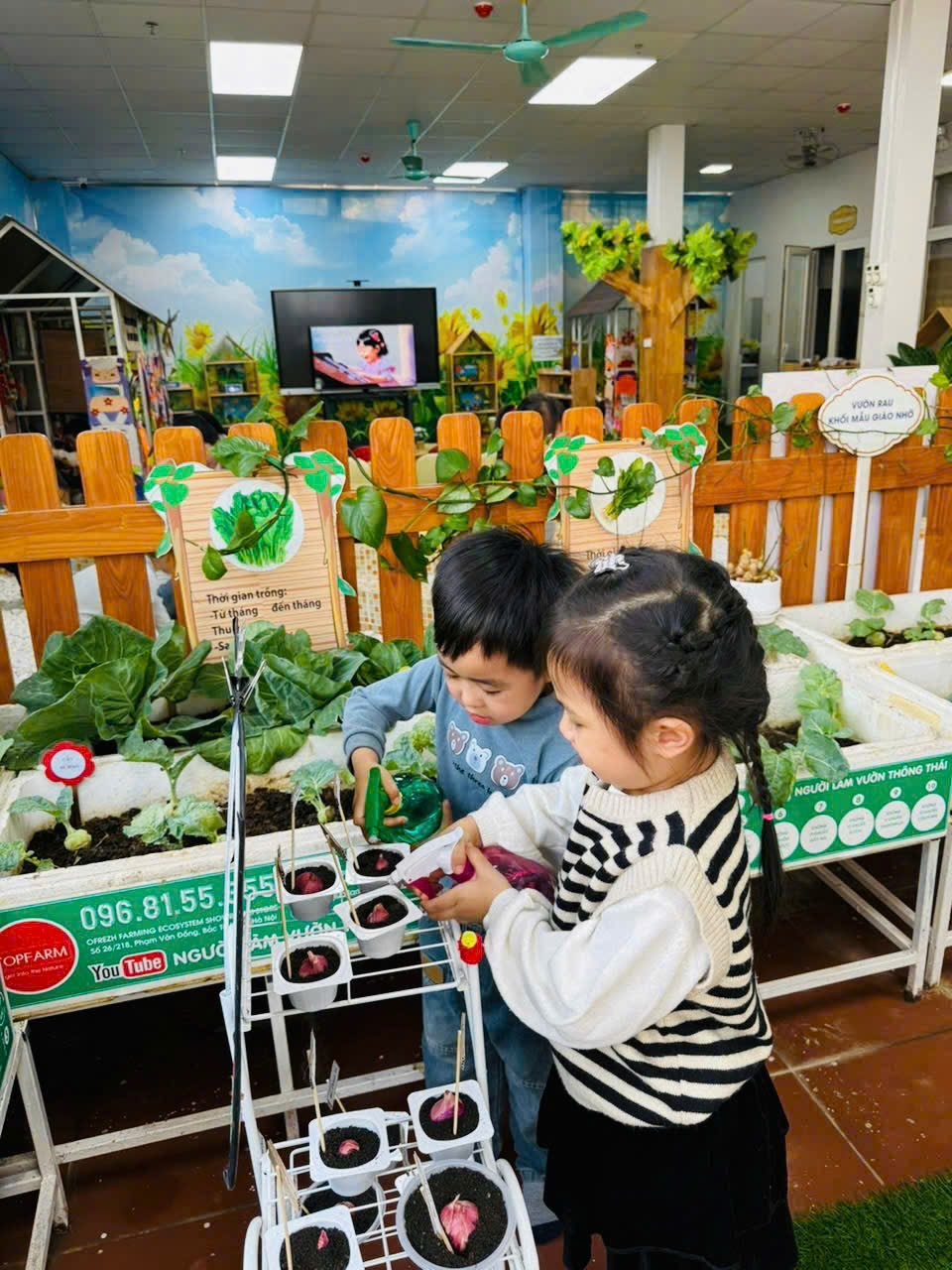 Các bé rất hào hứng khi tự tay đặt củ hành xuống đất, lấp đất và tưới nước cho cây. Qua hoạt động này, trẻ không chỉ rèn luyện sự khéo léo của đôi tay mà còn học được cách chăm sóc cây xanh, biết yêu thiên nhiên và hình thành ý thức bảo vệ môi trường.