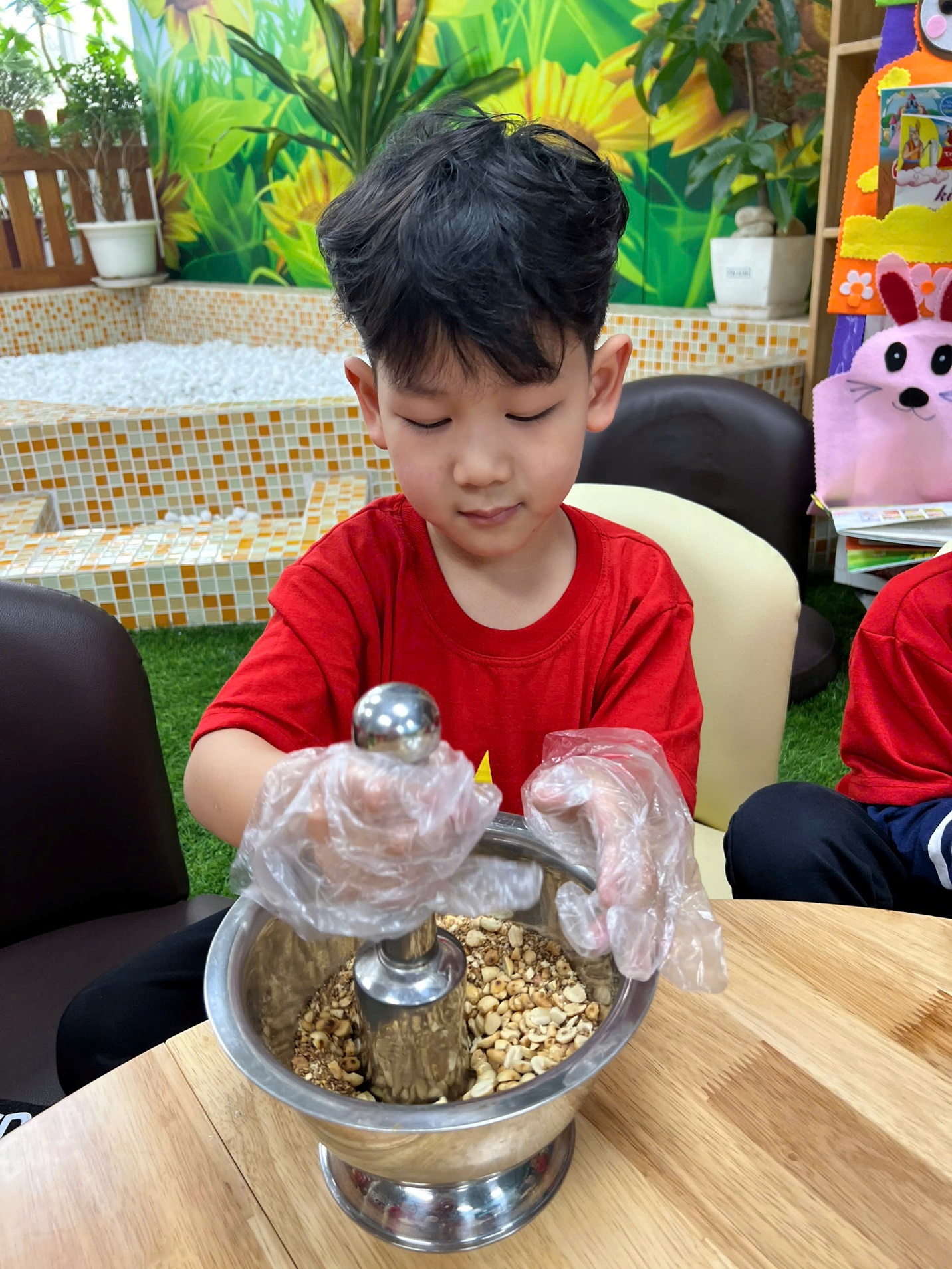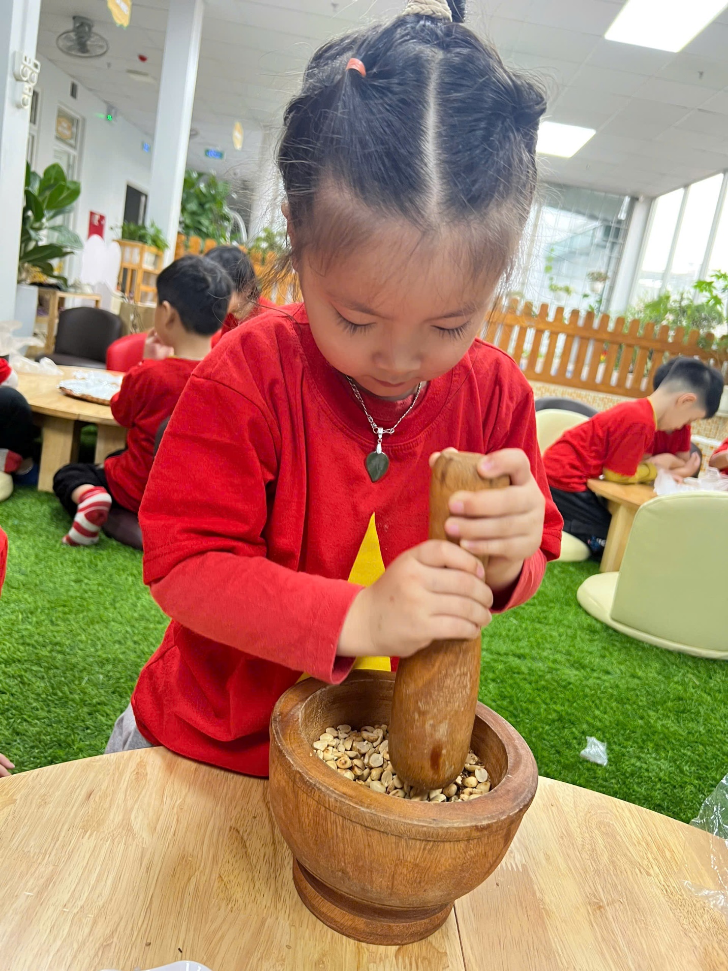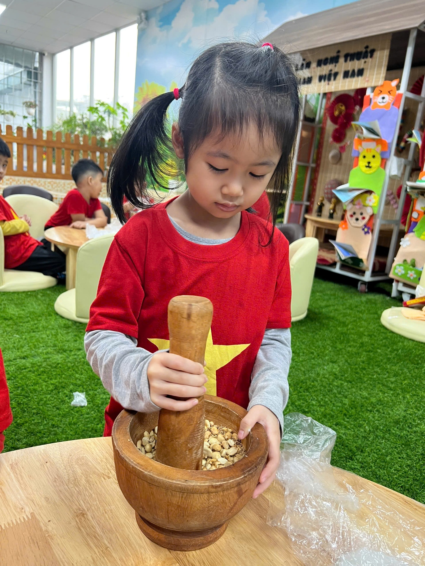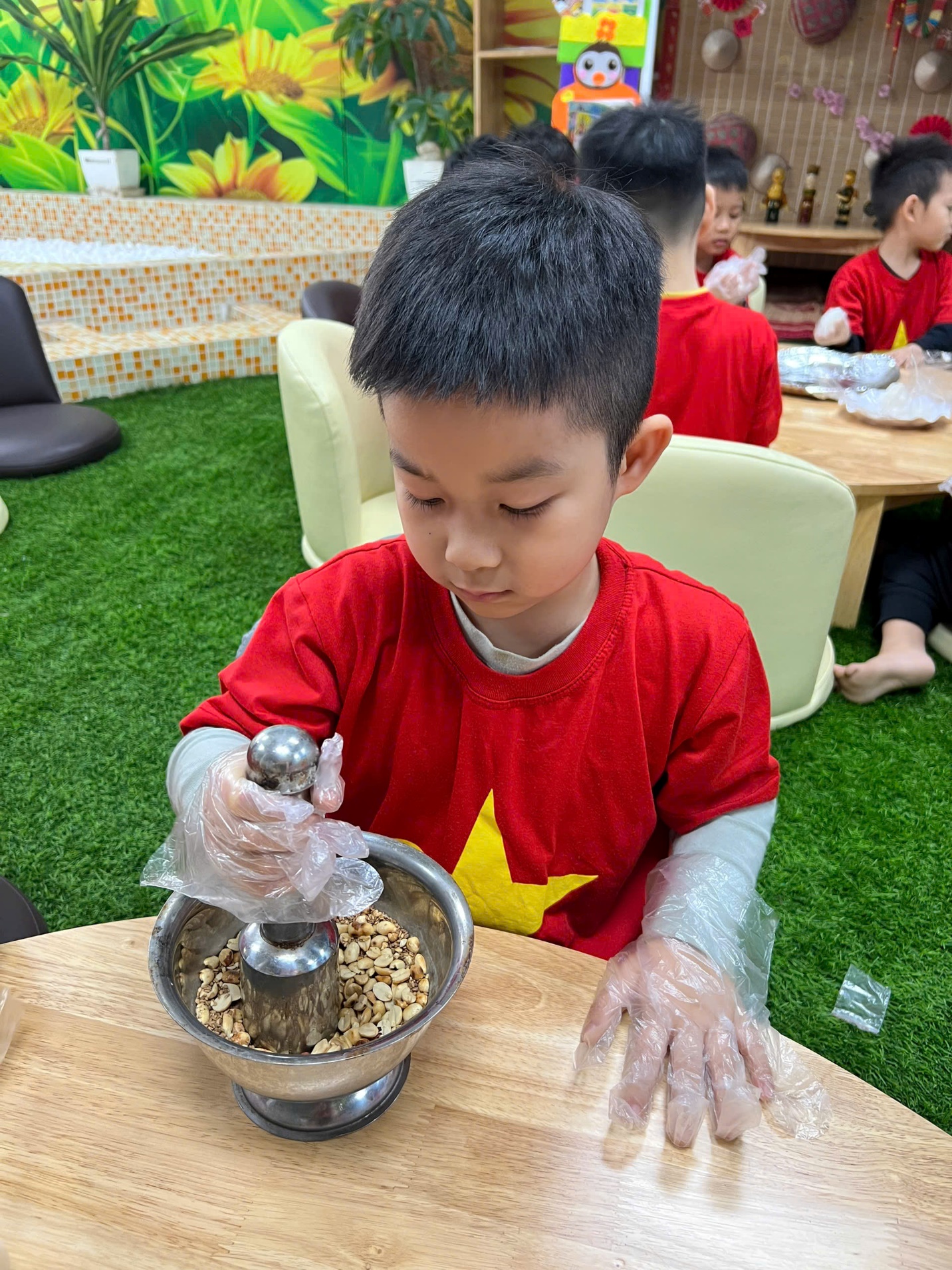 Song song với đó, các bé còn được trải nghiệm giã lạc vừng để làm muối lạc – món ăn dân dã nhưng giàu dinh dưỡng, gắn liền với ký ức của nhiều thế hệ bộ đội.
