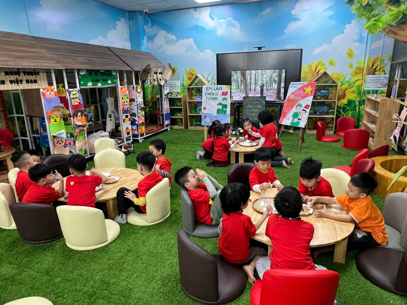 Các bé vừa ăn vừa trò chuyện, chia sẻ cảm nhận, tạo nên sự gắn kết và tinh thần tập thể.