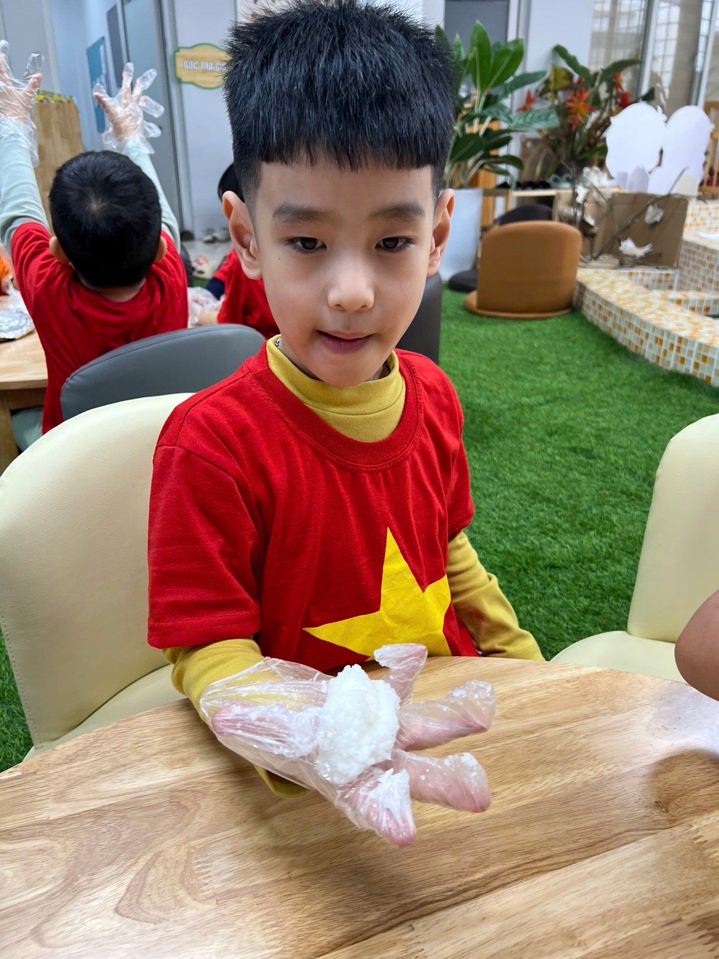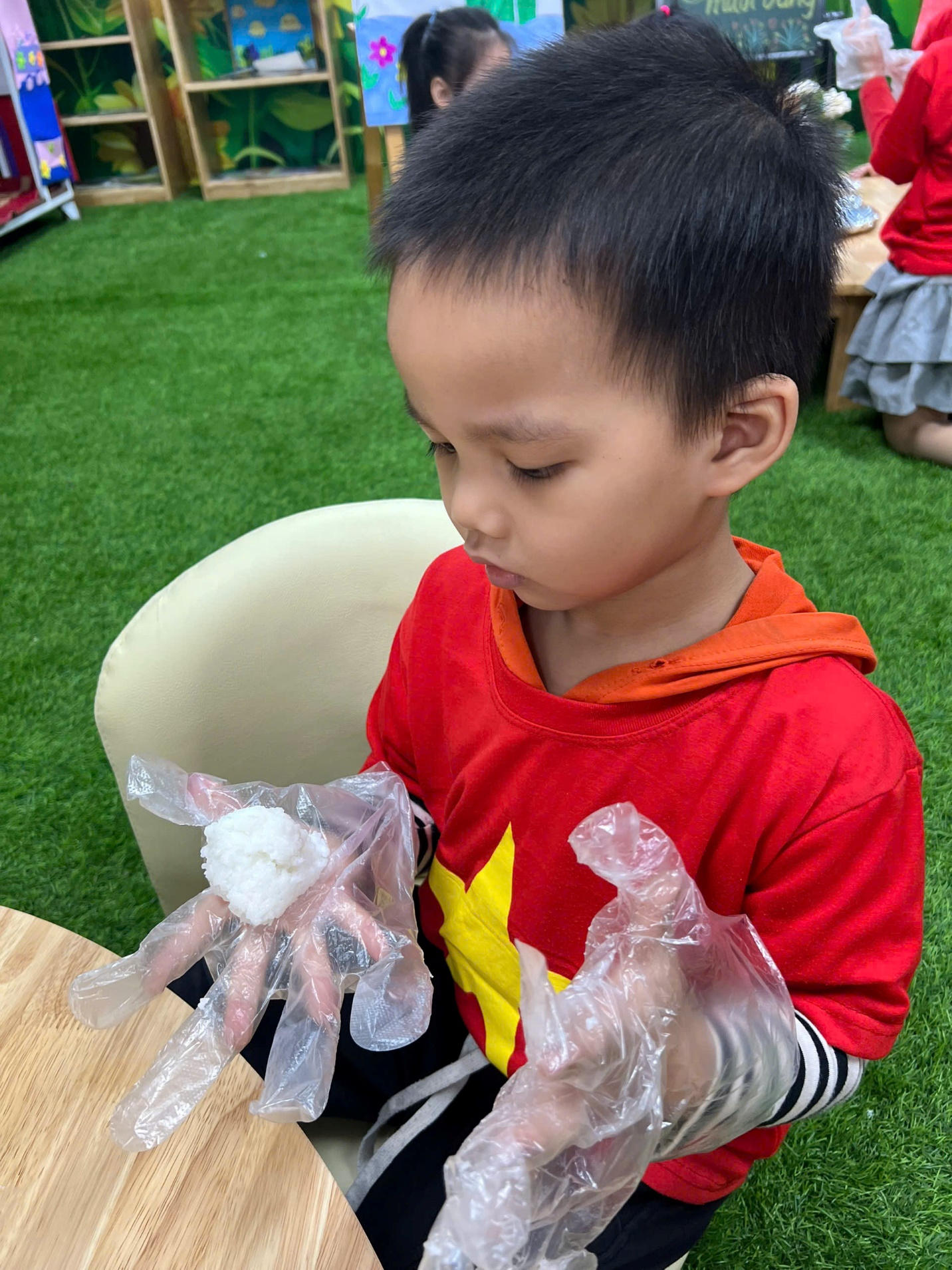 Bé nào cũng háo hức, đôi bàn tay nhỏ xinh cẩn thận vo viên từng nắm cơm trắng tinh.